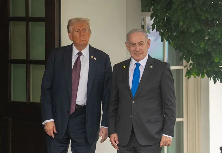 9月29日,在美国首都华盛顿白宫,美国总统特朗普(左)迎接到访的以色列总理内塔尼亚胡。特朗普当天宣布,内塔尼亚胡已同意美方就结束加沙冲突提出的“20点计划”。新华社记者胡友松摄
